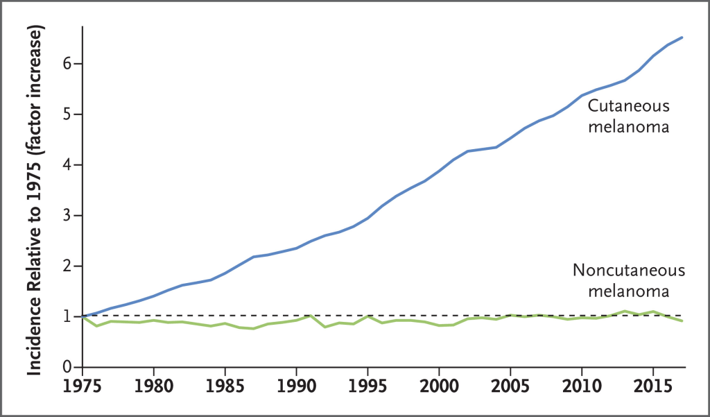 Malignt melanom (hudcancer) har ökat dramatiskt sedan 1970-talet, med en ökning på över 600 % i antal diagnoser. Samtidigt har dödligheten knappt förändrats alls. Detta tyder starkt på att många av de hudförändringar som diagnosticeras idag är harmlösa och aldrig hade orsakat några problem för patienterna.